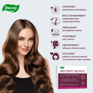 Таблетки Эксперт волос - инновационный1 комплекс натуральных витаминов, усиленных аминокислотами и микроэлементами, созданный специально для питания кожи головы и волос, поддержки их здоровой структуры и роста.