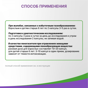 Взрослым и детям старше 6 лет по 2 капсулы 3–5 раз в сутки, можно с небольшим количеством жидкости, после каждого приема пищи и при необходимости перед сном. Продолжительность курса лечения зависит от наличия симптомов повышенного газообразования. При необходимости препарат можно применять в течение длительного периода времени.