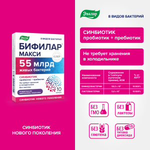 Бифилар Макси – это синбиотик нового поколения с мощным составом: 55 млрд. живых бактерий в каждой капсуле + пребиотик. Для быстрого восстановления микрофлоры кишечника.