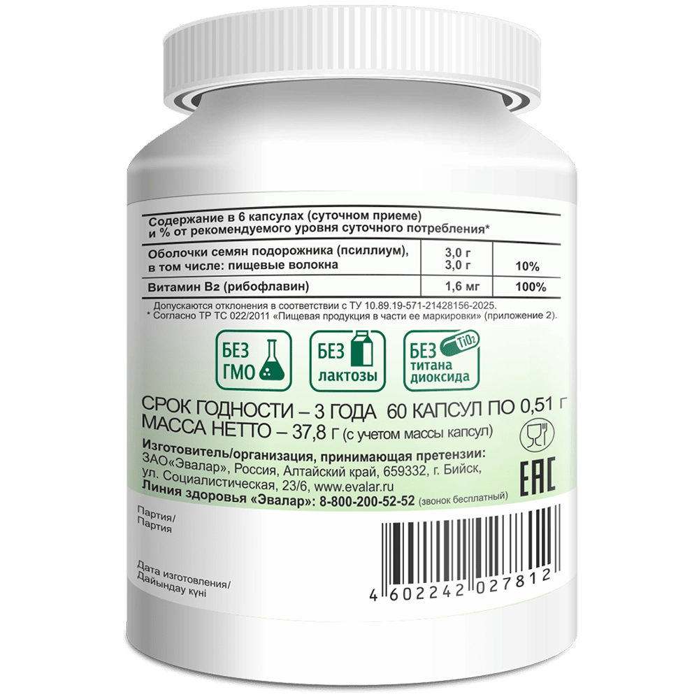 Оболочки семян подорожника (псиллиум); компонент капсулы желатин; диоксид кремния аморфный (агент антислеживающий), рибофлавин.