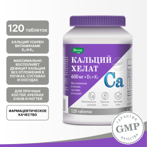 «Кальций хелат» от компании «Эвалар» — препарат на основе легкодоступного бисглицината кальция для максимального усвоения в сочетании с витамином D3 и витамином К2 в форме МК-7
