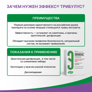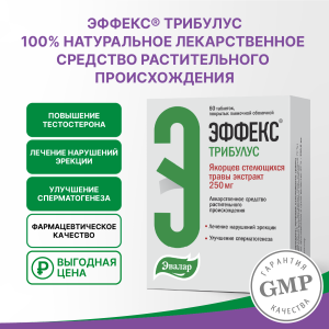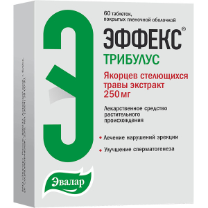ЭФФЕКС® Трибулус – средство растительного происхождения, получаемое из надземной части якорцев стелющихся (Tribulus terrestris L.), содержит преимущественно стероидные сапонины фуростанолового типа. Оказывает общетонизирующее действие и стимулирует некоторые функции половой системы. У мужчин восстанавливает и улучшает сексуальное либидо, удлиняет время эрекции. Стимулирует сперматогенез, увеличивая количество сперматозоидов и их подвижность. Механизм действия якорцев стелющихся экстракта неизвестен. Предполагается, что преобладающее соединение протодиосцин метаболизируется в организме до дегидроэпиандростерона (DHEA), который оказывает благоприятный эффект на иммунитет, целостность клеточной мембраны, эректильную функцию и метаболизм холестерина. Известно, что холестерин является исходным веществом для синтеза всех стероидов, включительно DHEA, тестостерона и эстрадиола, чем объясняется и гиполипидемический эффект препарата. Другие активные фуростаноловые сапонины, входящие в состав якорцев стелющихся экстракта, вероятно, модулируют эффект протодиосцина. Лекарственный препарат обладает гиполипидемическим эффектом, причем у пациентов с липопротеинемией снижает общий холестерин и липопротеиды низкой плотности, не влияет на значения сывороточных триглицеридов и липопротеидов высокой плотности.