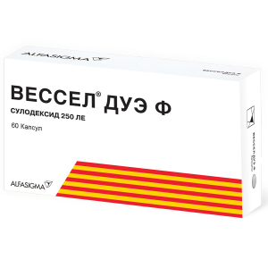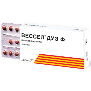 Вессел Дуэ Ф (сулодексид) является биологическим лекарственным препаратом, представляющим собой естественную смесь гликозаминогликанов (ГАГ): гепариноподобной фракции с молекулярной массой 8000 дальтон (80 %) и дерматансульфата (20 %).