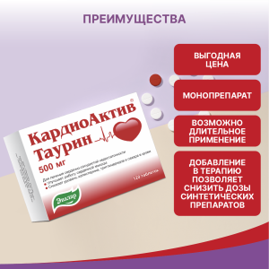 КардиоАктив® Таурин уменьшает побочные явления, возникающие при передозировке сердечных гликозидов и блокаторов «медленных» кальциевых каналов; снижает гепатотоксичность противогрибковых препаратов. Повышает работоспособность при тяжелых физических нагрузках.