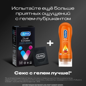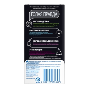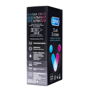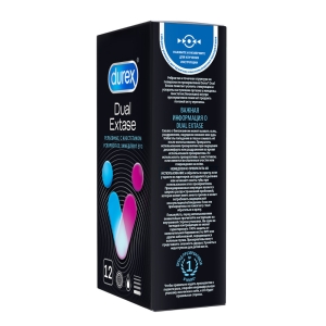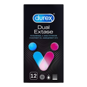 Анестетик (бензокаин - 0,14 г.) внутри презервативов Durex® Dual Extase может помочь продлить половой акт у мужчины, а ребра и пупырышки на поверхности презерватива могут помочь усилить стимуляцию и ускорить наступление оргазма у женщины. Обоюдное удовольствие – один из приоритетов сексуальных отношений!